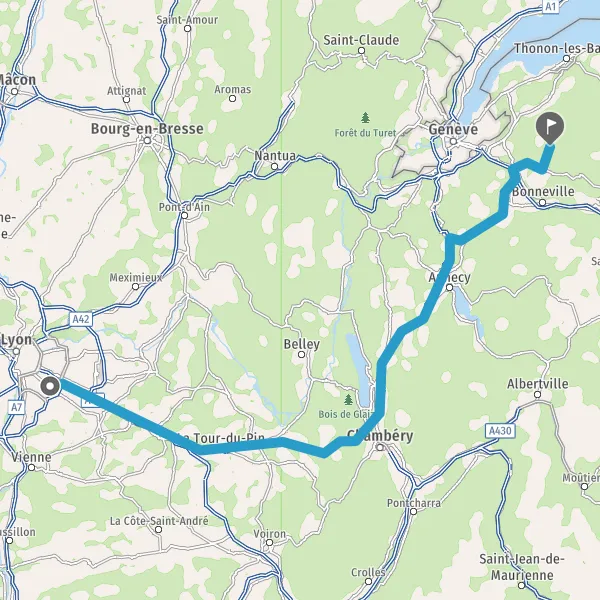 Prendre à droite et rejoindre A43 E711 E70. Continuer sur 34 kilomètres