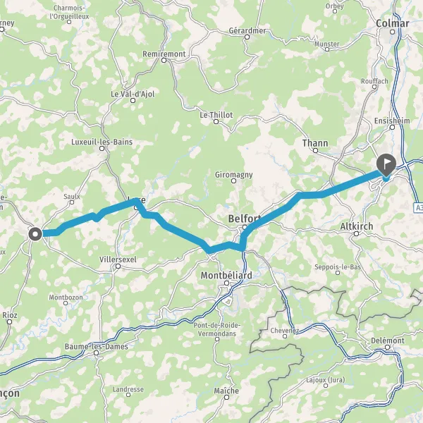 Avec le mode voiture, vous pouvez configurer vos options (type de véhicule, autoroute ou non, péage ou non, distance la plus courte), tout en ayant accès aux infos de circulation grâce à notre service d'info-trafic en temps réel. Ainsi faites des économies sur le coût ou la durée de votre voyage, en trouvant le trajet Vesoul Mulhouse adapté à vos besoins.
