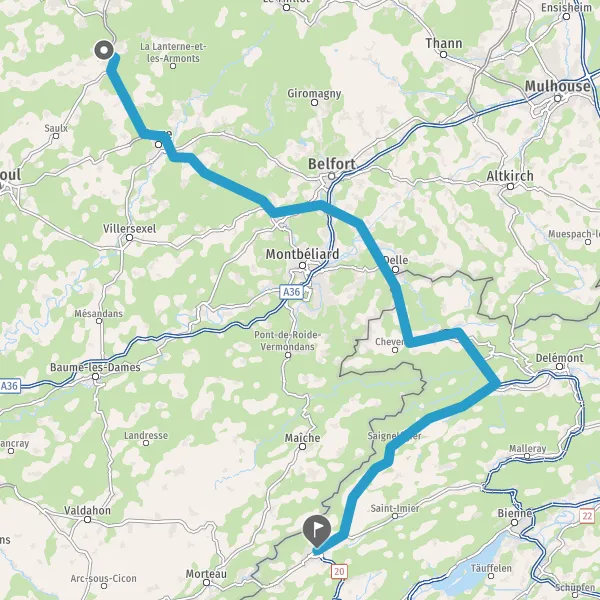 Au rond-point, prendre la 3ème sortie sur 18 (Rue de la Rauracie) et continuer sur 10 kilomètres