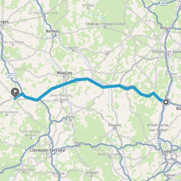 Prendre un ticket (Péage Molinet Est) Payer 1,30 € (Péage Molinet Ouest) Prendre un ticket (Péage Montbeugny Est) Payer 1,90 € (Péage Montbeugny Ouest) Prendre un ticket (Péage Le Montet Est) Payer 1,00 € (Péage Le Montet Ouest) Prendre un ticket (Péage Deux chaises) 68 km