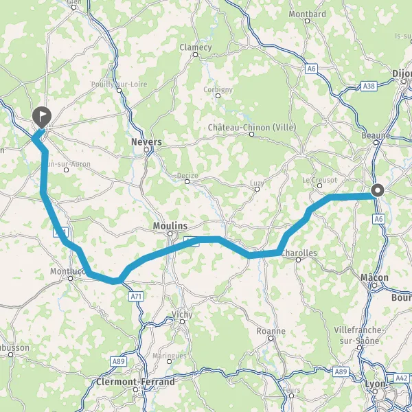 Prendre un ticket (Péage Molinet Est) Payer 1,30 € (Péage Molinet Ouest) Prendre un ticket (Péage Montbeugny Est) Payer 1,90 € (Péage Montbeugny Ouest) Prendre un ticket (Péage Le Montet Est) Payer 1,00 € (Péage Le Montet Ouest) Prendre un ticket (Péage Deux chaises) 31,2 km