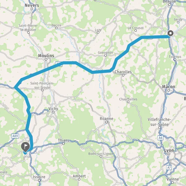 Prendre un ticket (Péage Molinet Est) Payer 1,30 € (Péage Molinet Ouest) Prendre un ticket (Péage Montbeugny Est) Payer 1,90 € (Péage Montbeugny Ouest) Prendre un ticket (Péage Le Montet Est) Payer 1,00 € (Péage Le Montet Ouest) Prendre un ticket (Péage Deux chaises) 31,2 km