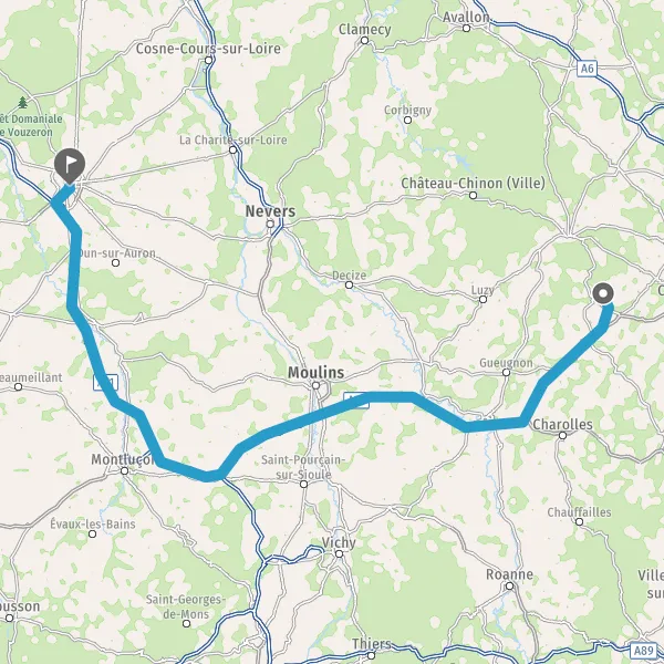 Prendre un ticket (Péage Molinet Est) Payer 1,30 € (Péage Molinet Ouest) Prendre un ticket (Péage Montbeugny Est) Payer 1,90 € (Péage Montbeugny Ouest) Prendre un ticket (Péage Le Montet Est) Payer 1,00 € (Péage Le Montet Ouest) Prendre un ticket (Péage Deux chaises) 14,1 km