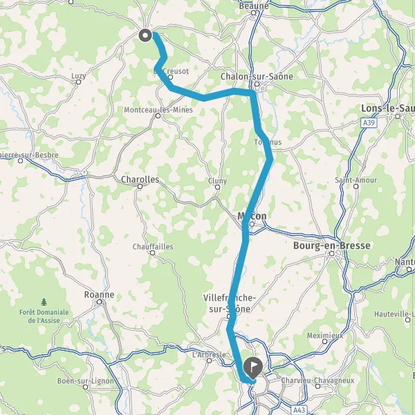 Tourner à droite sur D680 (Route de Chalon) et continuer sur 22 kilomètres