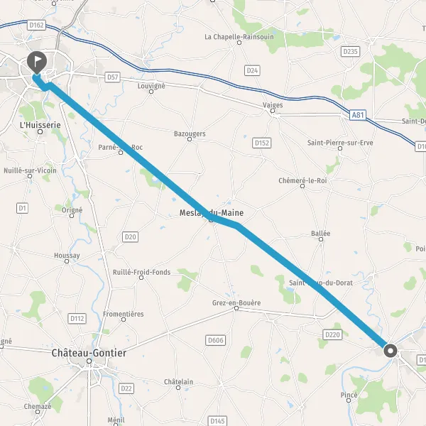 Au rond-point, prendre la 2ème sortie sur D21 (Rue de Laval) et continuer sur 5,2 kilomètres