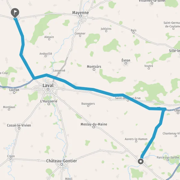 Au rond-point, prendre la 2ème sortie sur D21 (Rue de Laval) et continuer sur 5,2 kilomètres