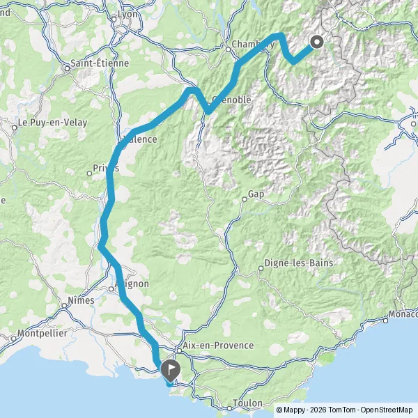Avec le mode voiture, vous pouvez configurer vos options (type de véhicule, autoroute ou non, péage ou non, distance la plus courte), tout en ayant accès aux infos de circulation grâce à notre service d'info-trafic en temps réel. Ainsi faites des économies sur le coût ou la durée de votre voyage, en trouvant le trajet Bourg-Saint-Maurice Marseille adapté à vos besoins.
