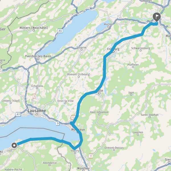 Entrer en Suisse et prendre 21 (Route Cantonale) sur 4,6 kilomètres