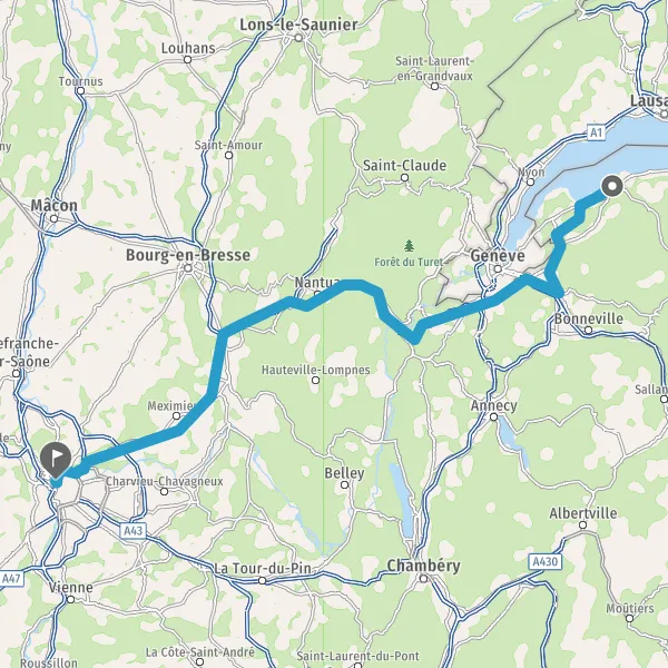 Au rond-point, prendre la 1ère sortie sur D1005 (Route de Genève) et continuer sur 4,8 kilomètres