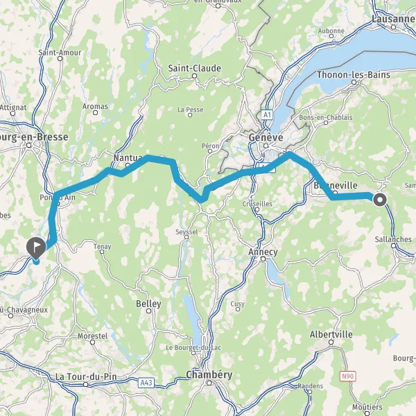 Au rond-point, prendre la 2ème sortie sur D1084 (Route de Genève) et continuer sur 4,6 kilomètres