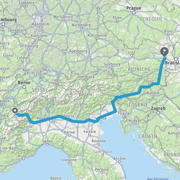 Entrer en Italie et prendre E25 T1 SS26dir SS26dir SS26dir (Traforo del Monte Bianco) sur 5,1 kilomètres
