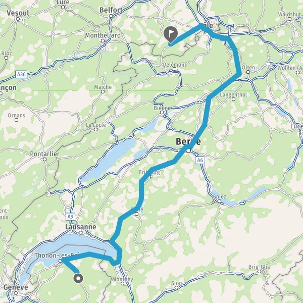 Entrer en Suisse et prendre 21 (Route Cantonale) sur 4,6 kilomètres