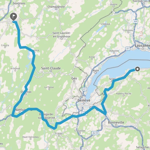 Au rond-point, prendre la 2ème sortie sur D1005 (Route de Genève) et continuer sur 4,8 kilomètres