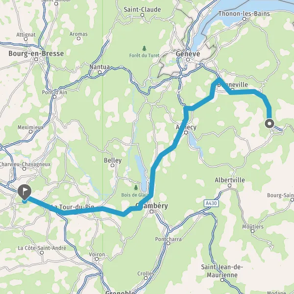 Prendre à droite et rejoindre A43 E70. Continuer sur 42 kilomètres