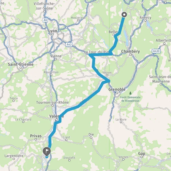 Prendre à droite et rejoindre A43 E70. Continuer sur 25 kilomètres