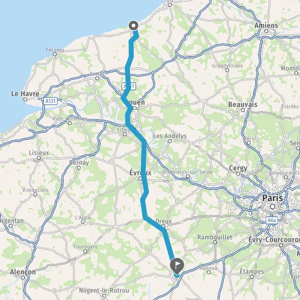 Prendre à droite et rejoindre A154. Continuer sur 28 kilomètres