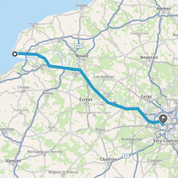 Prendre à droite et rejoindre A13 E5. Continuer sur 59 kilomètres