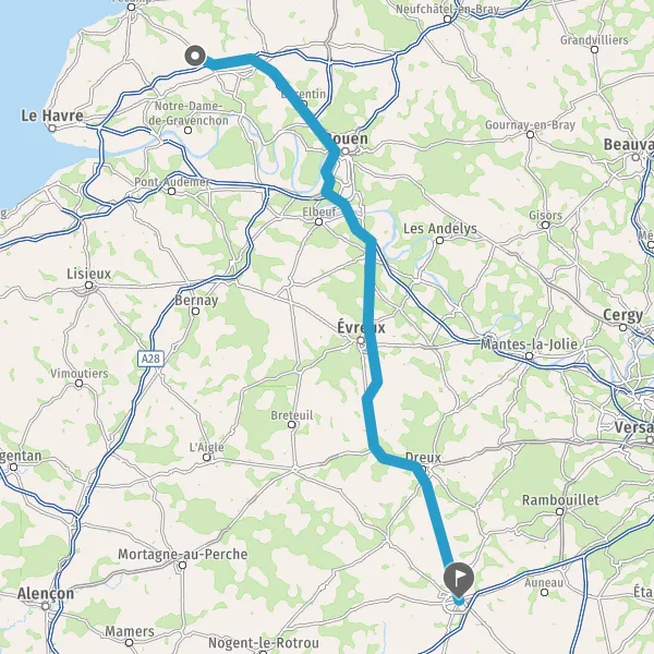 Prendre à droite et rejoindre A154. Continuer sur 28 kilomètres