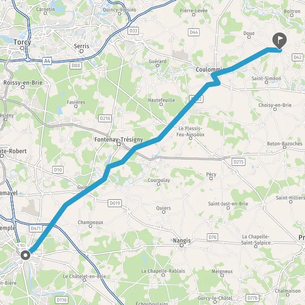 Au rond-point, prendre la 2ème sortie sur D222 (Rue de Rebais) et continuer sur 7 kilomètres