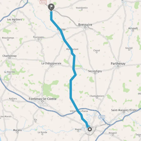 Au rond-point, prendre la 4ème sortie sur D744 (Route de Coulonges) et continuer sur 17 kilomètres