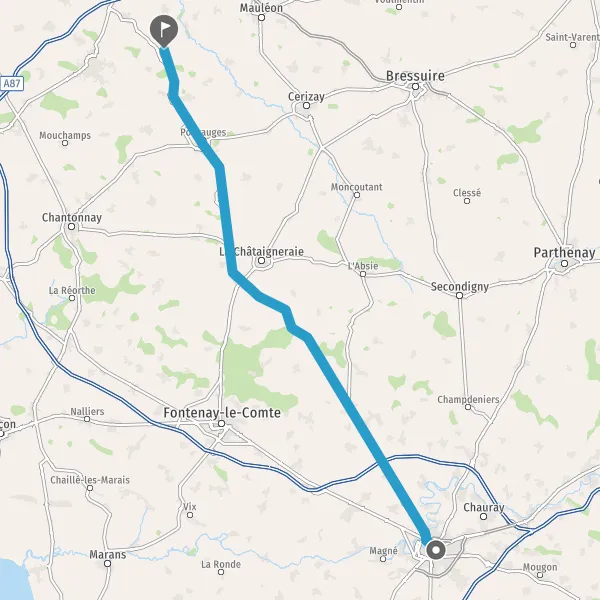 Au rond-point, prendre la 4ème sortie sur D744 (Route de Coulonges) et continuer sur 17 kilomètres
