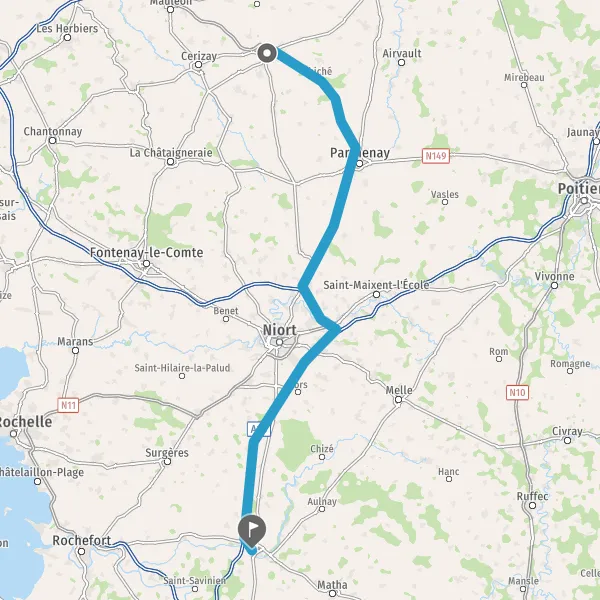 Tourner légèrement à droite sur D938ter (Rue de Niort) et continuer sur 40 kilomètres