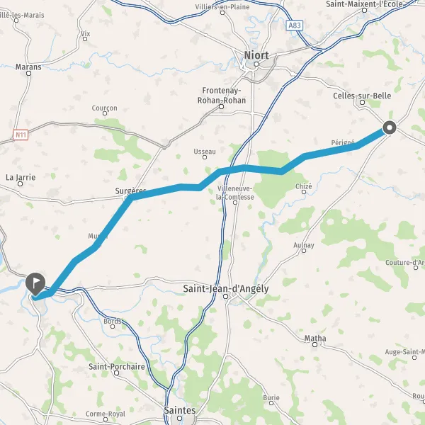Tourner à droite sur D53 (Route de Chize) et continuer sur 12 kilomètres