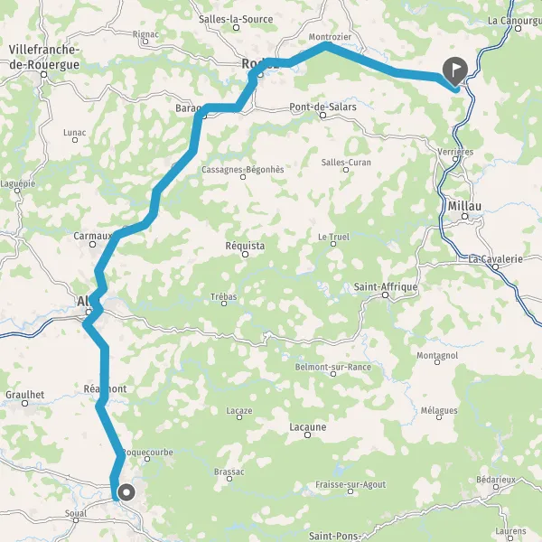 Au rond-point, prendre la 3ème sortie sur N88 (Route de Laissac) et continuer sur 32 kilomètres