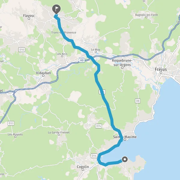 Au rond-point, prendre la 1ère sortie sur D25 (Route du Muy) et continuer sur 14 kilomètres
