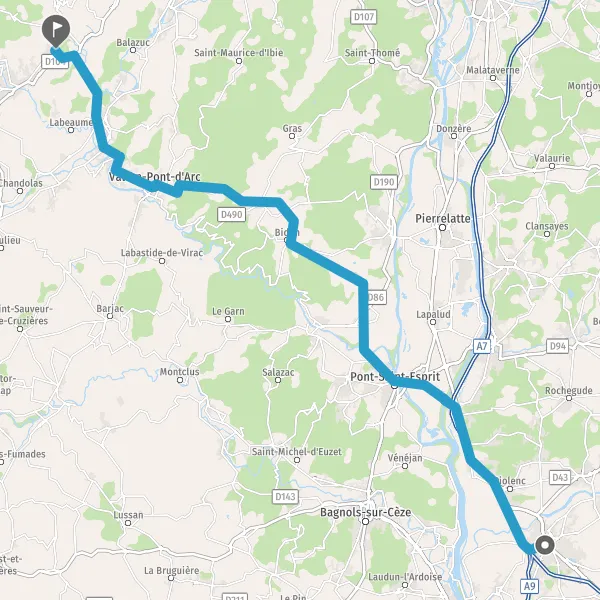 Au rond-point, prendre la 2ème sortie sur D579 (Route de Ruoms) et continuer sur 3,8 kilomètres