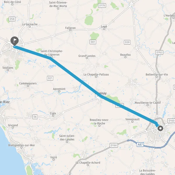 Prendre à droite et rejoindre D948 (Route de Challans). Continuer sur 19 kilomètres