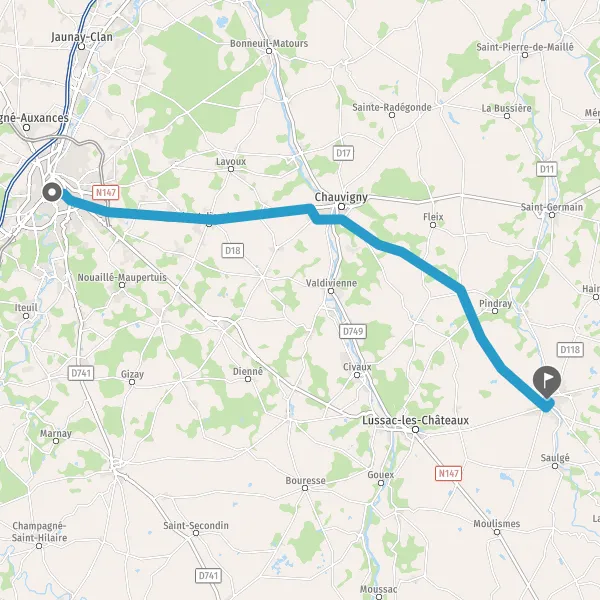 Au rond-point, prendre la 1ère sortie sur D54 (Rue de Montmorillon) et continuer sur 11 kilomètres