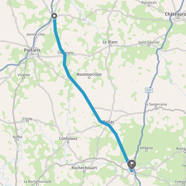 Au rond-point, prendre la 2ème sortie sur D749 (Rue de Lussac) et continuer sur 19 kilomètres