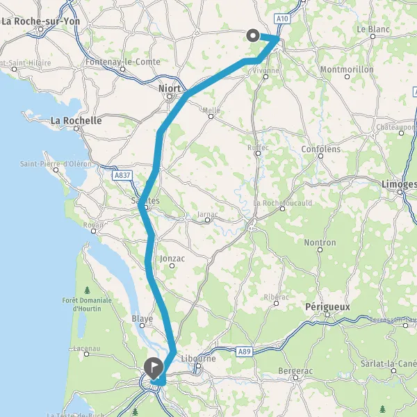 Avec le mode voiture, vous pouvez configurer vos options (type de véhicule, autoroute ou non, péage ou non, distance la plus courte), tout en ayant accès aux infos de circulation grâce à notre service d'info-trafic en temps réel. Ainsi faites des économies sur le coût ou la durée de votre voyage, en trouvant le trajet Vouillé Bordeaux adapté à vos besoins.