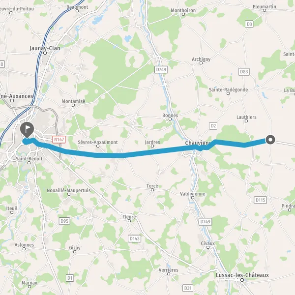 Au rond-point, prendre la 3ème sortie sur N151 (Route de Chauvigny) et continuer sur 550 mètres