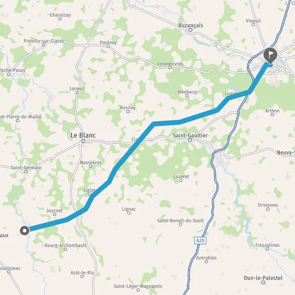 Tourner légèrement à gauche sur D20 (Route de Châteauroux) et continuer sur 5,5 kilomètres