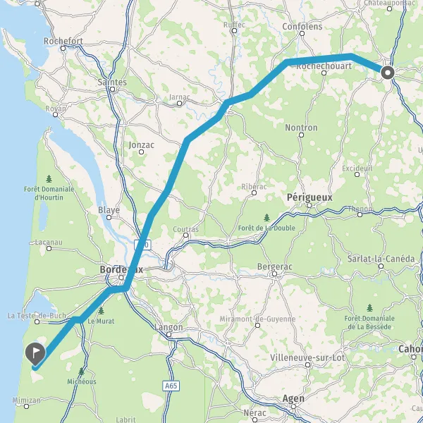 Prendre à droite et rejoindre A63. Continuer sur 25 kilomètres