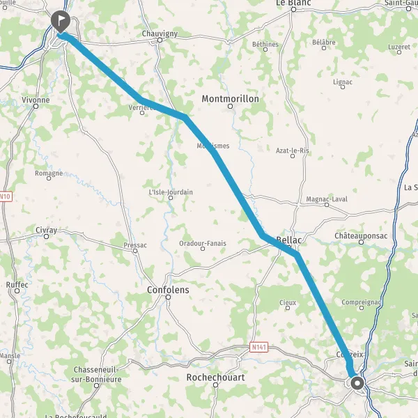 Au rond-point, prendre la 1ère sortie sur N147 (Route de Poitiers) et continuer sur 27 kilomètres