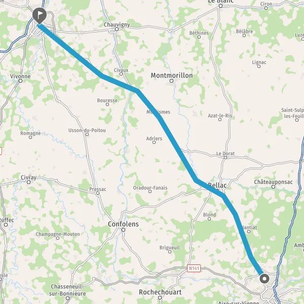 Au rond-point, prendre la 1ère sortie sur N147 (Route de Poitiers) et continuer sur 27 kilomètres