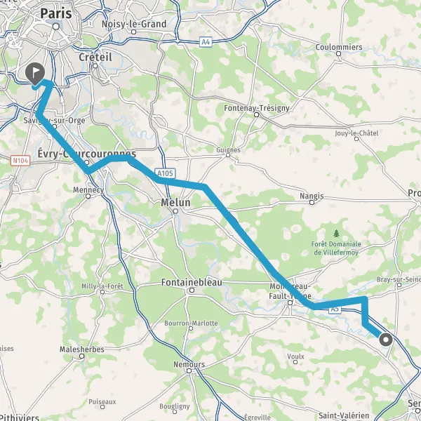 Prendre à droite et rejoindre N104 (La Francilienne). Continuer sur 9 kilomètres