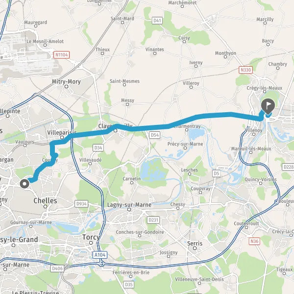 Au rond-point, prendre la 2ème sortie sur D34 (Route Départementale de Chelles) et continuer sur 1,4 kilomètre