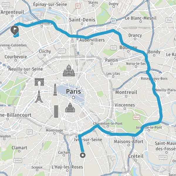 Prendre à droite et rejoindre D1 (Boulevard du Général Leclerc). Continuer sur 230 mètres