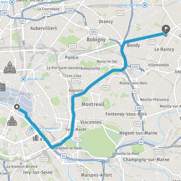 Prendre à droite et rejoindre D933 (Avenue du Général Gallieni). Continuer sur 550 mètres