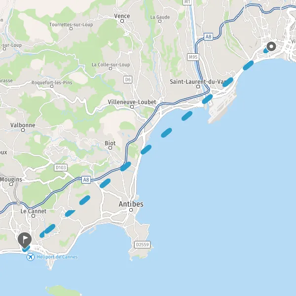 Ne perdez plus votre temps à chercher un vol pas cher, Mappy vous permet de comparer tous les prix et les horaires pour réserver votre billet d'avion de Nice à Cannes. Vous pouvez également comparer votre trajet Nice Cannes en avion, entre différentes compagnies (AirFrance, Easyjet, etc..) ou avec les autres modes de transports et calculer ainsi les économies de temps ou de coût réalisées.