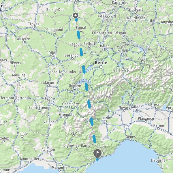 Venir à Nice. En voiture : la ville est desservie par l'autoroute A8 ""La Provençale"", en provenance d'Aix-en-Provence à l'Ouest et de la frontière à l’Est. En avion : plusieurs lignes de bus circulent entre Nice et l’aéroport Côte d’Azur. Les Bus 23 et 52 desservent le centre ville, ils marquent l’arrêt à proximité du terminal 1, le terminal 2 n’est pas desservi. Le Bus Aéroport Direct (anciennement Ligne 98) relie l’aéroport et le centre-ville en dehors des heures de fonctionnement du Tram 2. En bateau : liaisons maritimes entre Nice et la Corse. La Corse au départ du port de Nice, jusqu'à 7 départs par jour (en saison): 4 destinations, 2 compagnies maritimes. En train : les trains rapides et express (TGV, train corail) relient la Côte d’Azur à toutes les régions françaises et à toutes les grandes villes d’Europe. Le TGV Méditerranée permet d’effectuer le trajet Paris-Nice en 5h30. Les TER (Trains Express Régionaux) relient rapidement toutes les villes principales de la Côte d'Azur entre Cannes et Vintimille. En autocar : plusieurs compagnies de bus desservent la ville de Nice: Ouibus, Atlassib, Sindbad, Isilines, les Lignes Express Régionales Phocéens Cars, Eurolines et Flixbus.Se déplacer à Nice : en bus et tramway, en auto bleue (voiture électrique en libre service), en velo bleu (vélo en libre service), en taxi, en VTC, en covoiturage ou à pied.
