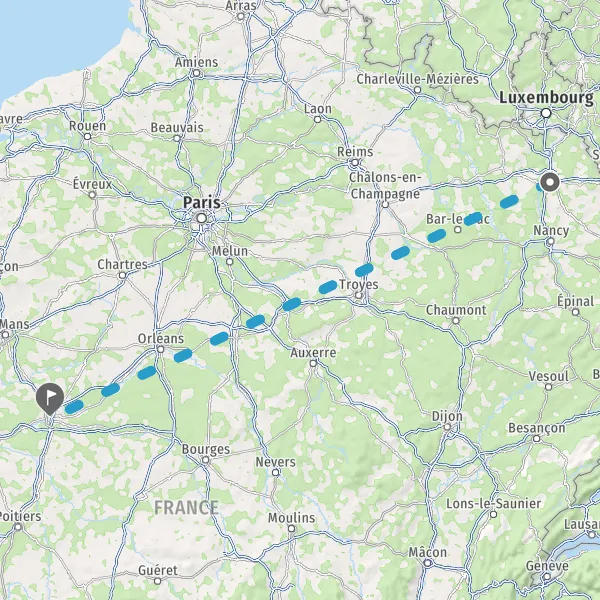 Venir à Tours. En voiture : 3 autoroutes desservent la Touraine : l’A10 (entre Paris et Bordeaux), l’A28 (entre Rouen et Tours) et l’A85 (entre Nantes et Bourges). Voici quelques indications de distances pour rallier Tours : Nantes (222 km), Paris (238 km), Rennes (242 km), Rouen (274 km), Bordeaux (348 km), Dijon (419 km), Lille (460 km), Lyon (463 km), Toulouse (525 km), Montpellier (664 km), Marseille (798 km), Nice (955 km). En autocar : la ville de Tours est desservie par autocar via les compagnies BlaBlaCar et ou Flixbus. En train : comptez 1h de TGV pour faire le trajet entre la gare de Paris Montparnasse et la gare de Tours / Saint-Pierre-des-Corps. D’autres liaisons directes sont proposées avec l’Ile-de-France : Massy (aéroport d’Orly), Marne-la-Vallée (Disneyland) et l’aéroport Roissy-Charles de Gaulle.Se déplacer à Tours : en vélo avec Velociti (service de location de vélo longue durée) ou avec Indigo Weel (vélos en libre-service), en transports en commun (la ville de Tours est desservie par le service de tram et bus de l'agglomération ""Fil bleu"" et le réseau départemental ""Fil vert""), en covoiturage avec covoiturons-en-touraine.com , en autopartage avec Citiz Tours (service de location de voiture en libre-service de courte durée), en taxi ou à pied.