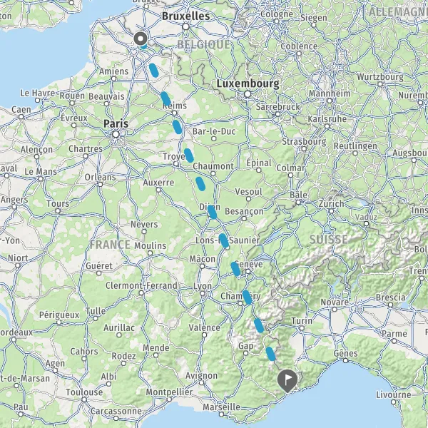 Venir à Nice. En voiture : la ville est desservie par l'autoroute A8 ""La Provençale"", en provenance d'Aix-en-Provence à l'Ouest et de la frontière à l’Est. En avion : plusieurs lignes de bus circulent entre Nice et l’aéroport Côte d’Azur. Les Bus 23 et 52 desservent le centre ville, ils marquent l’arrêt à proximité du terminal 1, le terminal 2 n’est pas desservi. Le Bus Aéroport Direct (anciennement Ligne 98) relie l’aéroport et le centre-ville en dehors des heures de fonctionnement du Tram 2. En bateau : liaisons maritimes entre Nice et la Corse. La Corse au départ du port de Nice, jusqu'à 7 départs par jour (en saison): 4 destinations, 2 compagnies maritimes. En train : les trains rapides et express (TGV, train corail) relient la Côte d’Azur à toutes les régions françaises et à toutes les grandes villes d’Europe. Le TGV Méditerranée permet d’effectuer le trajet Paris-Nice en 5h30. Les TER (Trains Express Régionaux) relient rapidement toutes les villes principales de la Côte d'Azur entre Cannes et Vintimille. En autocar : plusieurs compagnies de bus desservent la ville de Nice: Ouibus, Atlassib, Sindbad, Isilines, les Lignes Express Régionales Phocéens Cars, Eurolines et Flixbus.Se déplacer à Nice : en bus et tramway, en auto bleue (voiture électrique en libre service), en velo bleu (vélo en libre service), en taxi, en VTC, en covoiturage ou à pied.