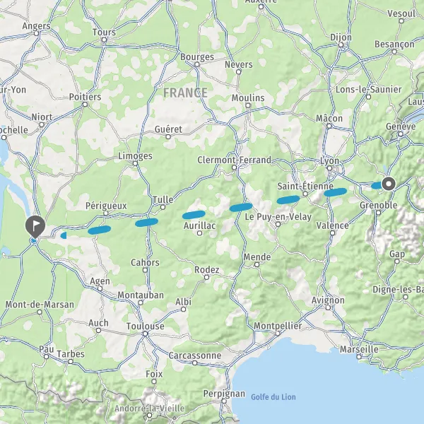 Venir à Bordeaux par la route. 4 autoroutes mènent à Bordeaux : A10 depuis Paris et les régions de l'Ouest et du Nord via Poitiers, Nantes, Orléans. A62 depuis la Méditerranée via Toulouse, Montauban et Agen. A63 depuis l'Espagne via Bayonne et Dax. A89 depuis le Sud-Est et l'Est via Lyon, Clermont-Ferrand et Périgueux. Venir à Bordeaux en train : la gare Saint-Jean accueille le TGV Bordeaux/Paris-Montparnasse, 4 allers-retours Bordeaux/Lille, 2 allers-retours Bordeaux/Strasbourg, 200 TER (Train express régionaux) reliant la capitale régionale à toutes les villes d'Aquitaine. Venir à Bordeaux en avion : l'aéroport international de Bordeaux Mérignac est situé à 12 km du centre ville. L'aéroport est desservi par la liane 1+ du réseau TBC (elle relie l'aéroport à la gare Saint-Jean de Bordeaux) et par la navette 30'direct (au départ du Hall B, ces navettes directes conduisent à la gare SNCF Saint Jean en 30 minutes selon la circulation). Venir à Bordeaux en bâteau : les paquebots de croisière et les bateaux de plaisance s'ammarent au célèbre Port de la Lune.