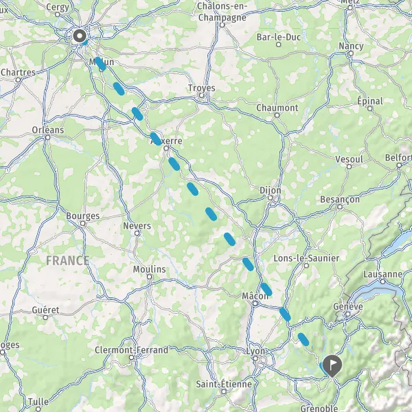 Venir à Chambéry. En voiture : Chambéry est desservie par les autoroutes A43 depuis Lyon ou l’Italie, A41 depuis Genève ou Grenoble, A6 depuis Paris et A7 depuis Marseille. En train : liaisons quotidiennes avec Paris par TGV (3h). La future liaison TGV Lyon-Turin permettra de mettre Chambéry à moins de 3 h de Milan et à 2h30 de Paris. De nombreux trains régionaux TER Auvergne-Rhône-Alpes relient Chambéry à Annecy, Lyon, Grenoble, Bourg-Saint-Maurice, Modane. En autocar : Belle Savoie Express est le réseau de transport interurbain en Savoie, une dizaine de lignes relient Chambéry à d’autres villes du département. Chambéry est également connectée aux départements voisins grâce à quelques lignes des réseaux Transisère et Car Ain. Plusieurs compagnies de bus desservent également la gare routière de Chambéry depuis de nombreuses villes de France et d’Europe: Flixbus et BlaBlaBus. En avion : l’Aéroport de Chambéry Savoie Mont Blanc est situé à une dizaine de km au nord du centre-ville. Il est desservi de décembre à avril par les Compagnies Flybe, Bristish Airways, Transavia, SAS et Charter Flights qui proposent des vols en provenance et à destination des Pays Bas, du Royaume-Uni et de la Suède. Se déplacer à Chambéry : plusieurs moyens de transport sont à disposition. Transports en commun: le réseau de bus STAC comprend 4 lignes chronos (1 bus toutes les 10mn), 15 lignes régulières et 9 lignes de transport à la demande. Voiture (près de 6 000 places payantes pour stationner), covoiturage et autopartage Citiz. Vous pouvez aussi vous déplacer à vélo. La Vélostation vous propose un service de Vélobulles, des triporteurs électriques qui vous prennent et vous déposent où vous le voulez sur un circuit prédéfini de 3km. Le Grand Chambéry est parcouru par près de 80km d’aménagements cyclables, dont 4 voies vertes totalement dédiées aux modes de déplacements doux (vélos, piétons, rollers…).