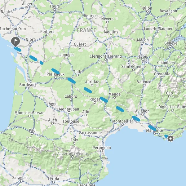 Venir à La Rochelle. Par la route : Paris : 467 km, Lyon : 650 km, Marseille : 825 km, Nantes : 146 kmBordeaux : 180 km, Toulouse : 400 kmset Strasbourg : 950 km. Par le train : Paris-La Rochelle : 3h en TGV et Bordeaux-La Rochelle / Nantes-La Rochelle : 2h en train Intercités.Se déplacer à La Rochelle : le bus de mer (une ligne régulière entre le Vieux Port et les Minimes), le passeur (liaison entre la médiathèque et le Vieux Port), location de vélos, location de voitures électriques (Yélomobile), en bus (réseau de 25 lignes de bus desservant la ville et ses alentours proches), taxis, VTC, liaisons maritimes (Bac Fouras / Aix, liaison maritime La Rochelle - Boyardville).